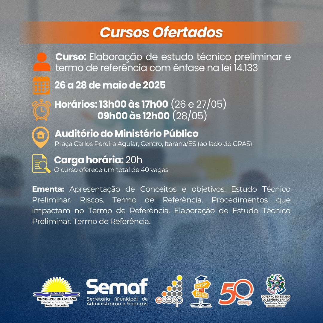 As formações continuam voltadas para temas essenciais da administração pública. Ao todo, serão oferecidos diversos cursos durante cinco dias de evento. As inscrições para a maioria das capacitações seguem abertas, com exceção dos cursos "Elaboração de Estudo Técnico Preliminar e Termo de Referência com Ênfase na Lei 14.133/21" e "Gestão Orçamentária e Financeira para Municípios", que já tiveram todas as vagas preenchidas devido à alta demanda.