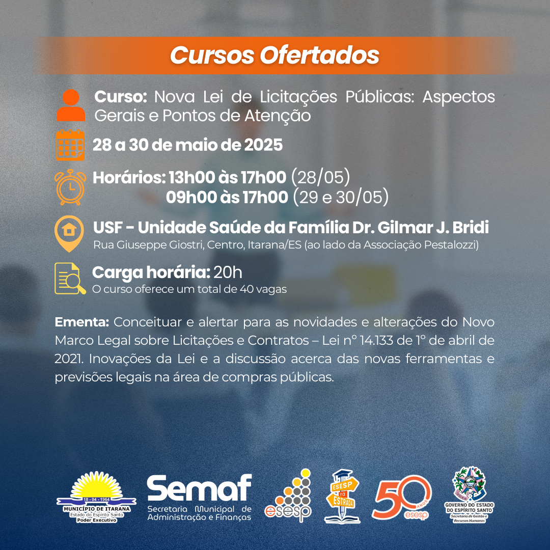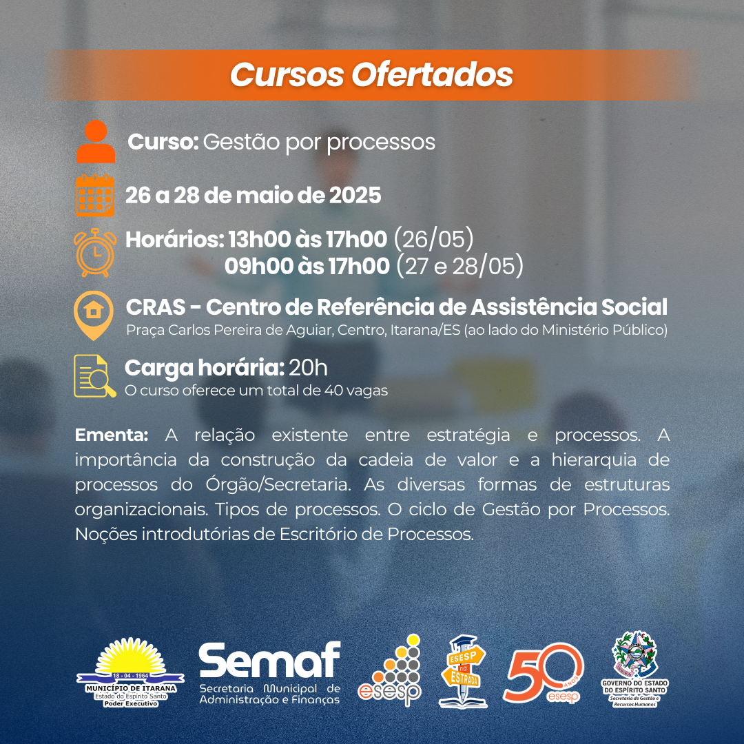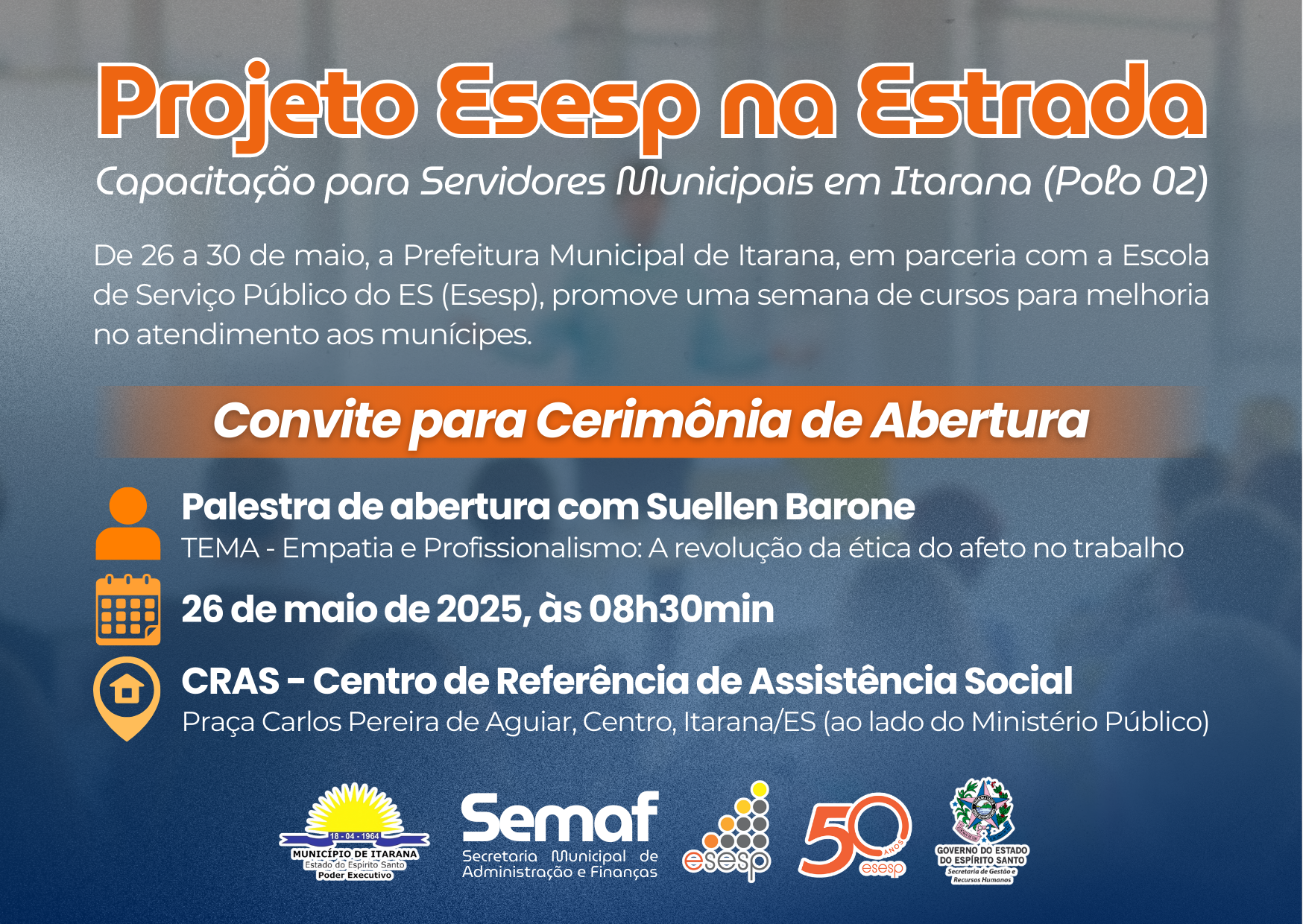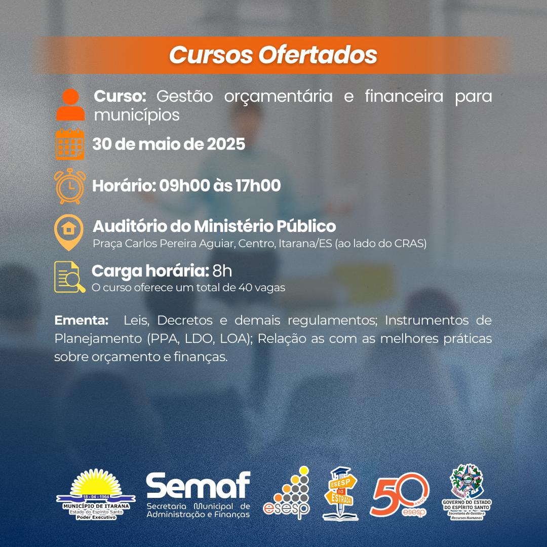 O município de Itarana segue como Polo Estratégico 02 do Projeto Esesp na Estrada 2025, iniciativa da Escola de Serviço Público do Espírito Santo (Esesp), que leva capacitações presenciais a diferentes regiões do estado. A ação, que acontecerá entre os dias 26 a 30 de maio do presente ano, passou por ajustes e traz novidades que ampliam as oportunidades de formação para os servidores públicos da região.