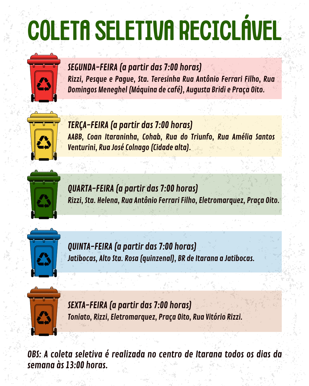 A Prefeitura Municipal de Itarana, por meio da Secretaria Municipal de Meio Ambiente, reforça a importância da coleta seletiva no município como uma ação fundamental para a preservação ambiental, a promoção da sustentabilidade e o cuidado com a nossa cidade.