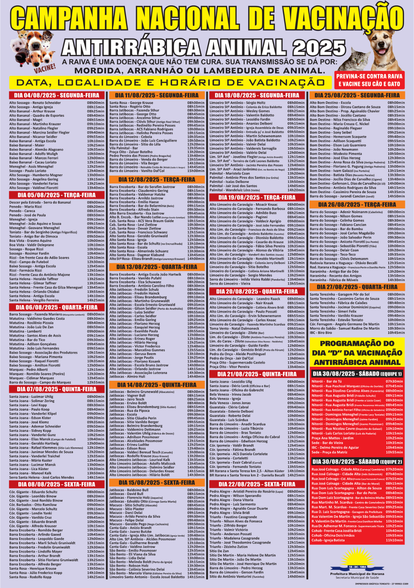 A campanha segue até o dia 27 de agosto, com cronograma de vacinação nos bairros da sede e nas localidades do interior do município (confira o cronograma completo abaixo). É importante que os animais sejam levados por pessoas adultas e habituadas com eles, para garantir segurança durante a aplicação da vacina.