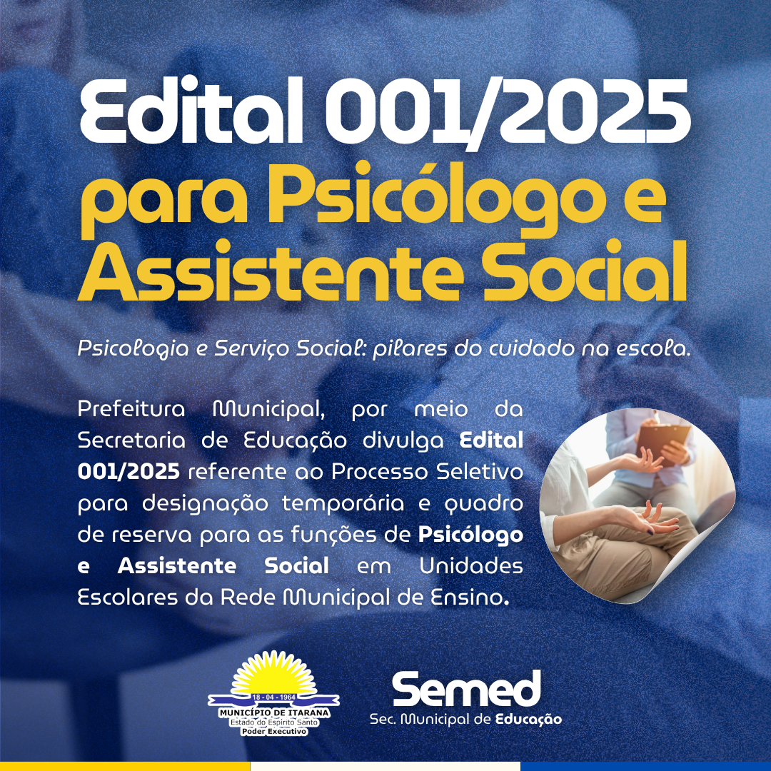 Prefeitura de Itarana divulga processo seletivo para Psicólogo e Assistente Social na Rede Municipal de Ensino