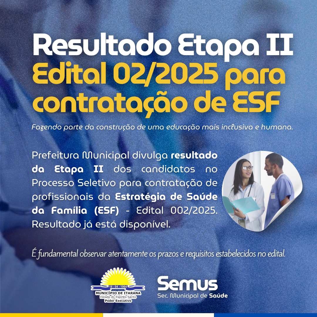 A Prefeitura Municipal de Itarana, por meio da Secretaria Municipal de Saúde, divulga o resultado da Etapa II – Entrevista do Processo Seletivo Simplificado para contratação de profissionais do Programa Estratégia Sa...