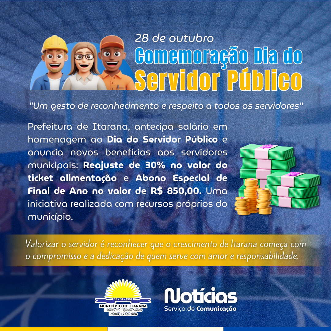Em comemoração ao Dia do Servidor Público, celebrado nesta terça-feira (28), a Prefeitura Municipal de Itarana anunciou a antecipação do pagamento dos salários para todos os servidores municipais. A in...