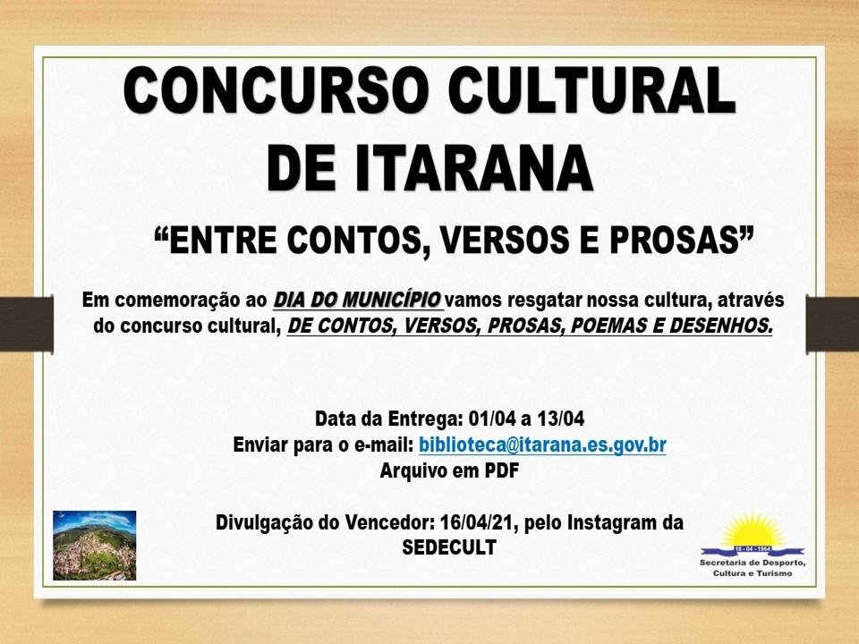 Como abril é mês de aniversário de Itarana, comemorado no dia 18, o concurso homenageará seus 57 anos de Emancipação Política. Com uma das inspirações o nosso hino municipal, Sempre Alegre e Hospitaleira e Bela, Próspera e Altaneira, as pessoas estão livres para criarem seus contos, versos, prosas, poemas e desenhos, relacionados aos costumes, tradições, histórias e outros aspectos do nosso lugar.