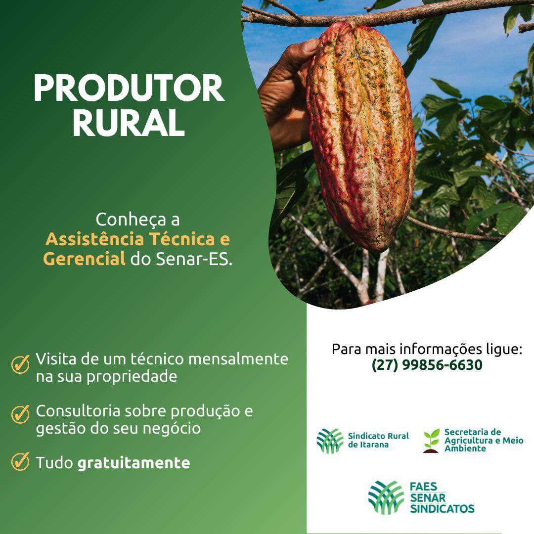 O Serviço Nacional de Aprendizagem Rural (Senar) do Espírito Santo, através da Federação da Agricultura e Pecuária do Estado do Espírito Santo (FAES) e do Sindicato Rural de Itarana, oferece Assistência Técnica e Gerencial para produtores rurais de cacau do município.
