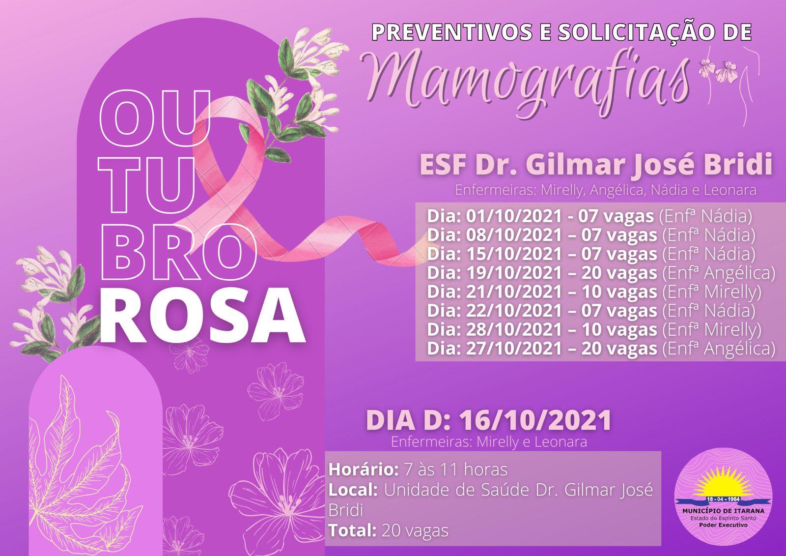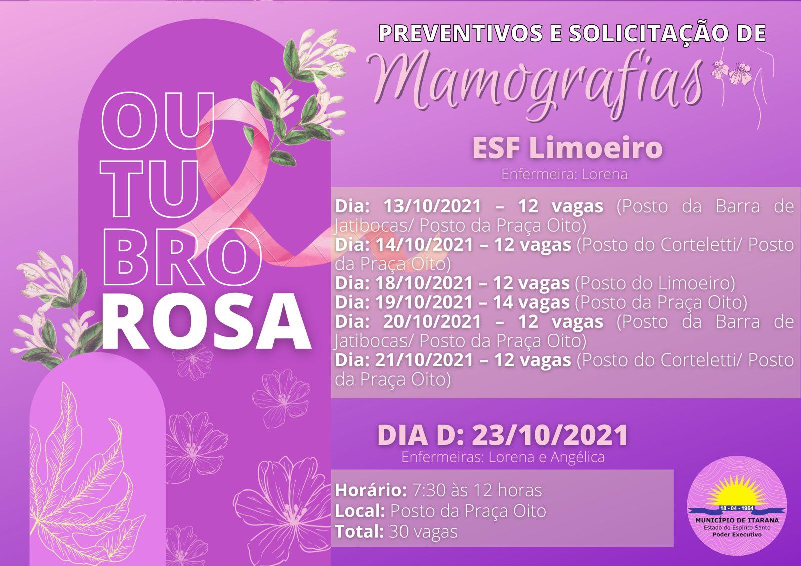 O Movimento Outubro Rosa, que acontece em todo o mundo, é uma campanha realizada com o objetivo de chamar a atenção das mulheres para prevenção e diagnóstico precoce do câncer de mama. Apoiando a causa, a Prefeitura Municipal de Itarana, através da Secretaria Municipal de Saúde (Semus), vai promover diversas atividades durante o mês de outubro.