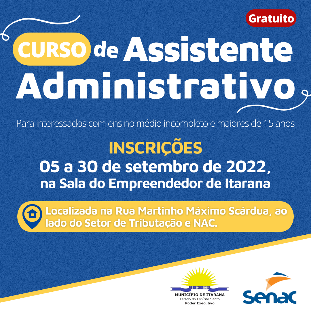 A Prefeitura Municipal de Itarana em parceria com o Senac de Santa Teresa oferta o curso de qualificação profissional de Assistente Administrativo, gratuito para toda a população.