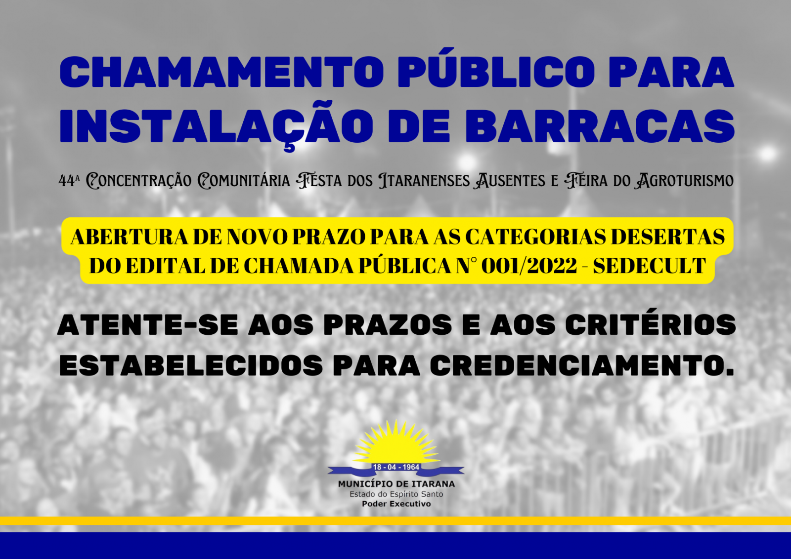 Foi aberto hoje (16) novo prazo para habilitação nas categorias desertas do Chamamento Público n° 001/2022 (Sedecult) para concessão de exploração comercial, referente as festividades da 44ª Concentração Comunitária, Festa dos Itaranenses Ausentes e Feira do Agroturismo de Itarana/ES.