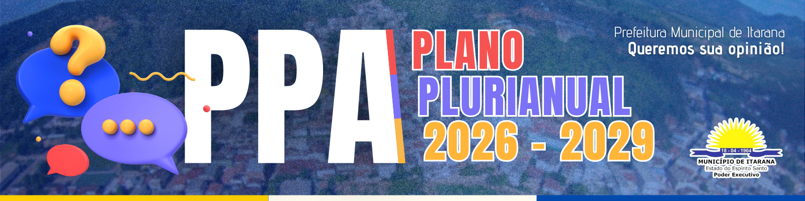 A Prefeitura Municipal de Itarana, por meio da Secretaria de Administração e Finanças (Semaf), está promovendo a participação da população na construção do Plano Plurianual (PPA) 2026–2029. Para isso, disponibiliza um formulário online que pode ser acessado clicando aqui. A consulta pública estará aberta até o dia 18 de agosto (segunda-feira).
