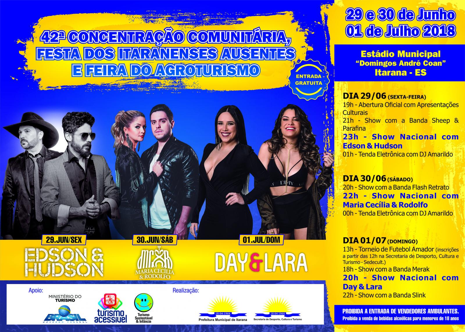 Começa no dia 29 de junho (sexta-feira), e vai até o dia 01 de julho (domingo), a 42ª Concentração Comunitária, Festa dos Itaranenses Ausentes e Feira do Agroturismo, a festa mais tradicional do município de Itarana. Neste ano o evento conta com as atrações nacionais: Edson e Hudson, Maria Cecília e Rodolfo e Day e Lara - artistas contratados com apoio do Ministério do Turismo através de convênio firmado com a Prefeitura Municipal de Itarana. A entrada é gratuita em todo os dias do evento.