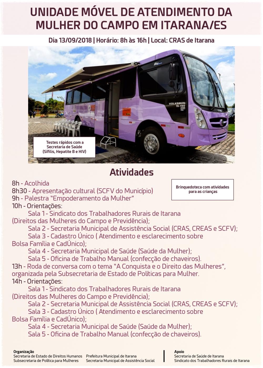 No dia 13 de setembro as mulheres terão uma programação especial em Itarana. Nesse dia o município vai receber a visita da Unidade Móvel de Atendimento da Mulher do Campo, do Governo do Estado. O ônibus lilás ficará localizado no Cras de Itarana, das 08 às 16 horas.