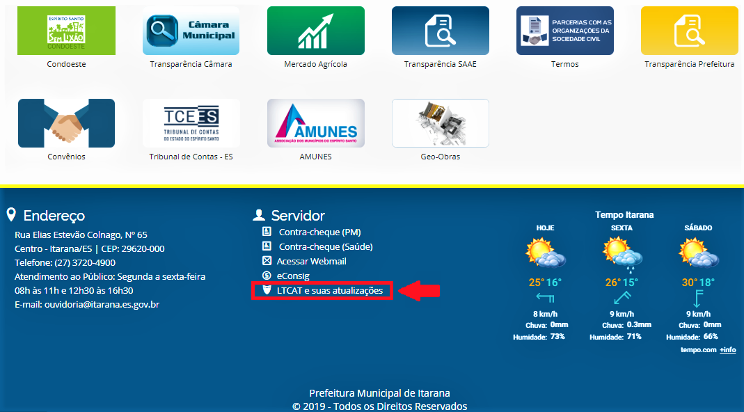 A Prefeitura Municipal de Itarana informa aos servidores e aos demais interessados, que está disponível em nosso site oficial, as atualizações do Laudo Técnico das Condições Ambientais do Trabalho (LTCAT) 2019-2020. Para visualizar, basta acessar https://www.itarana.es.gov.br/ e se direcionar para a parte inferior (rodapé) do portal em: LTCAT e suas atualizações, ou clicar no link abaixo para um acesso direto.
