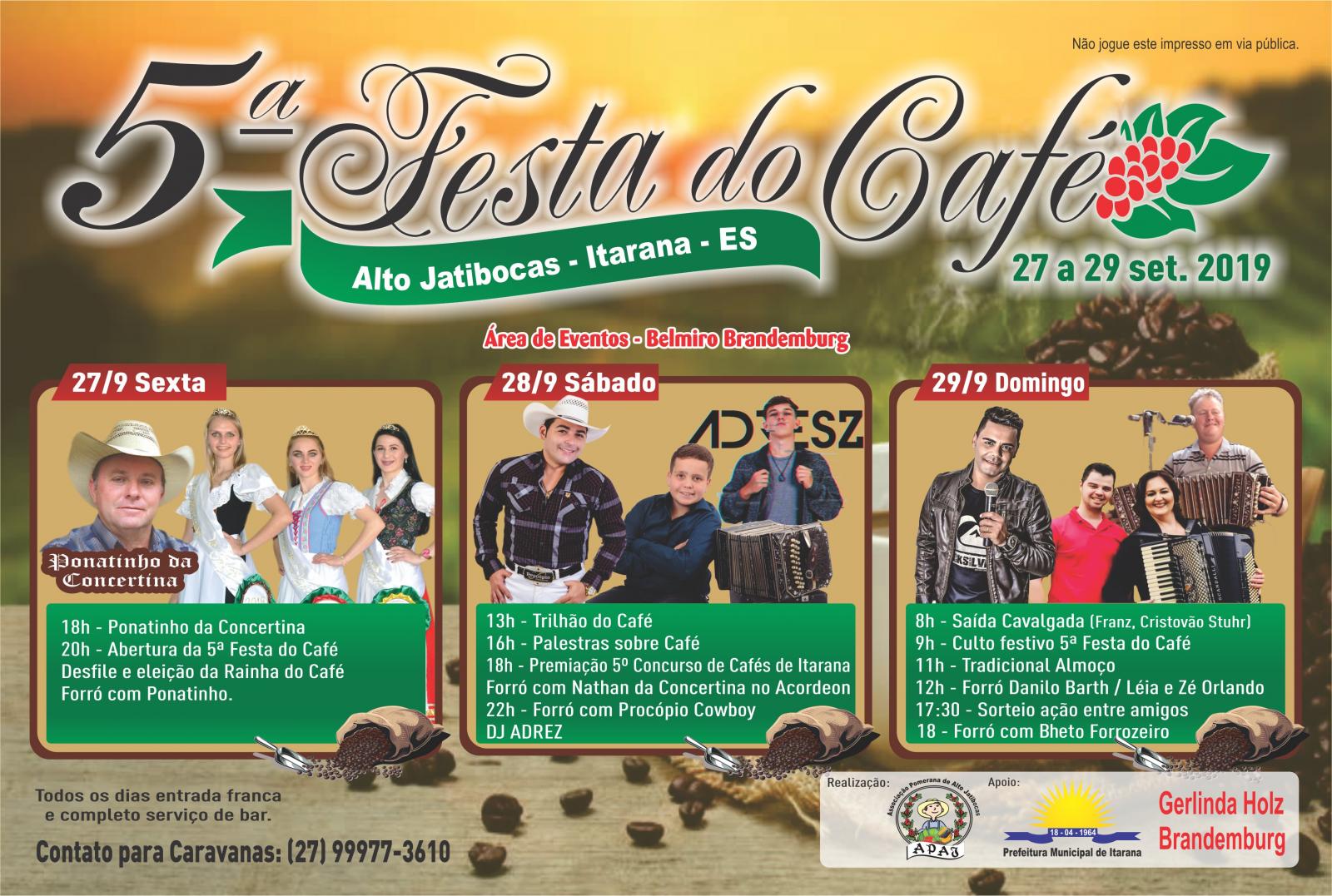 Será realizada nos dias 27, 28 e 29 de setembro a 5ª Festa do Café de Alto Jatibocas no interior do município de Itarana, na área de eventos Belmiro Brandemburg. A programação terá início na sexta-feira (27), com a abertura oficial e a eleição da Rainha do Café. O evento ainda traz como atrativo, a réplica de uma casa pomerana, o Kafa Wäga (técnica utilizada antigamente por descendentes pomeranos para secar e guardar grãos), pretendendo assim chamar a atenção do público, buscando resgatar aspectos históricos e culturais da região.