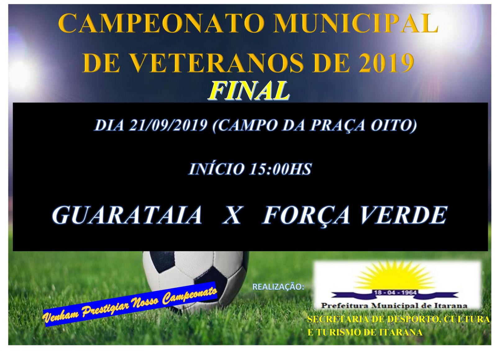 O futebol no município de Itarana é um esporte que movimenta não só os fanáticos pela modalidade, mas também toda população, a qual prestigia as partidas e vibra a cada partida. O Campeonato Municipal de Veteranos 2019, promovido pela Secretaria Municipal de Desporto, Cultura e Turismo (Sedecult), está chegando ao fim e terá sua final no próximo sábado, dia 28 de setembro, no Campo do Rizzi, às 15h.