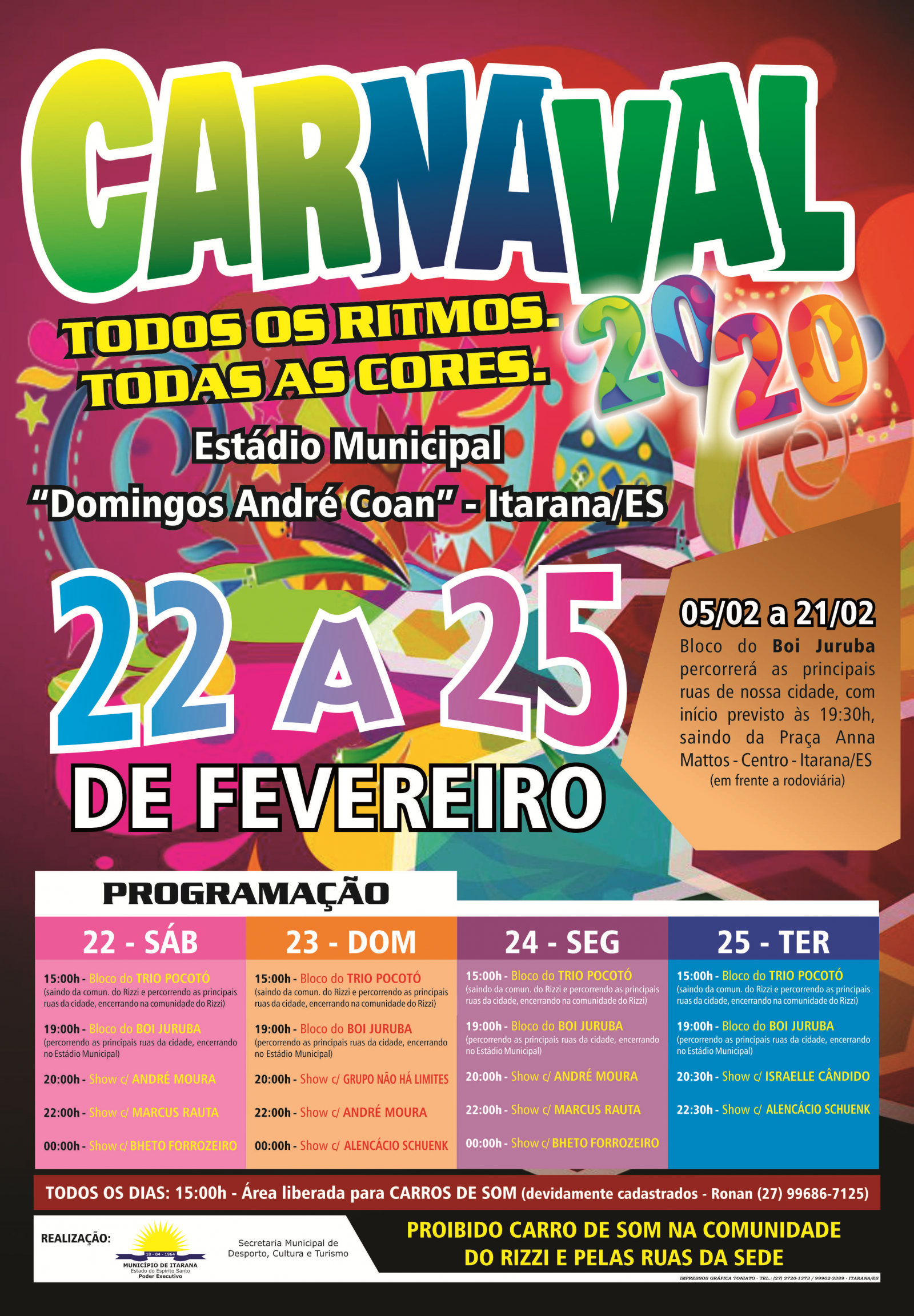 A Prefeitura Municipal de Itarana, por meio da Secretaria Municipal de Desporto, Cultura e Turismo (Sedecult), divulga a programação oficial do Carnaval de Itarana 2020. Com a saída do Trio Pocotó e do Bloco Boi Juruba, os festejos ainda contam com shows musicais, ritmos e cores, para animar ainda mais essa contagiosa época do ano.
