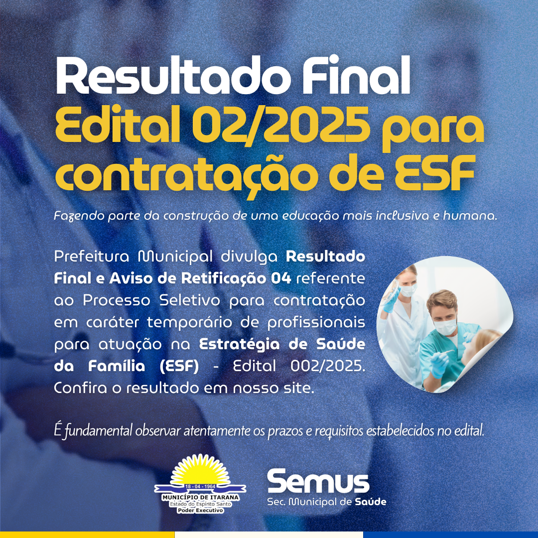 A Prefeitura Municipal de Itarana, por meio da Secretaria Municipal de Saúde, torna público o Resultado Final e a convocação dos(as) candidatos(as) classificados(as) no Processo Seletivo Simplificado – Edital nº...