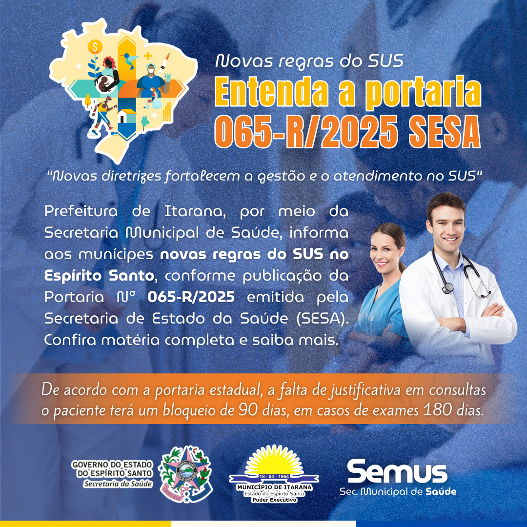 A Prefeitura Municipal de Itarana, por meio da Secretaria Municipal de Saúde, informa que a Secretaria de Estado da Saúde (SESA) realizou, em 22 de setembro de 2025, uma atualização no sistema MV CMCE, utilizado na regula&...