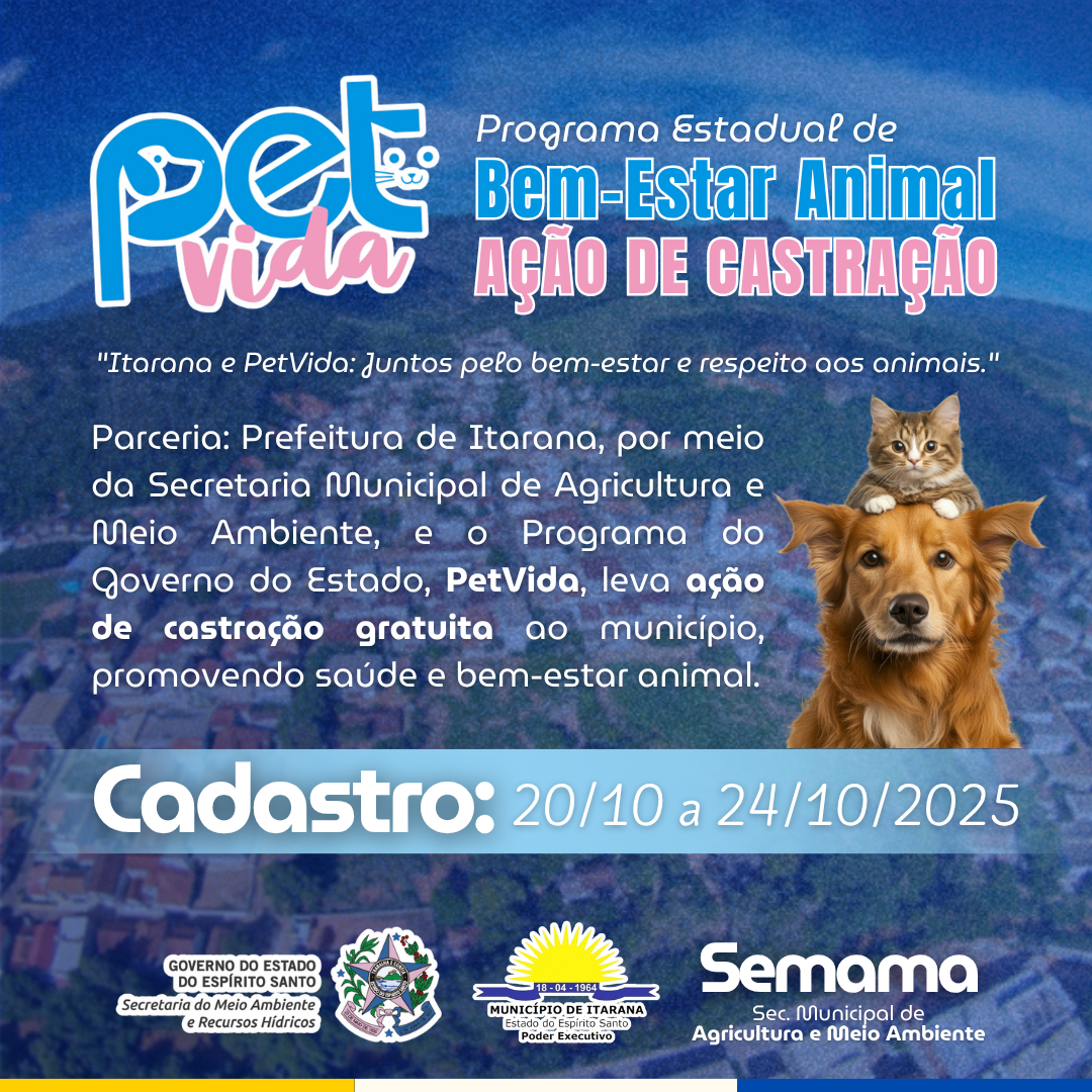 A Prefeitura Municipal de Itarana, em parceria com o Governo do Estado do Espírito Santo, por meio do Programa Estadual de Bem-Estar Animal (PetVida), realizará um importante Programa de Castração de Animais no munic&iacut...