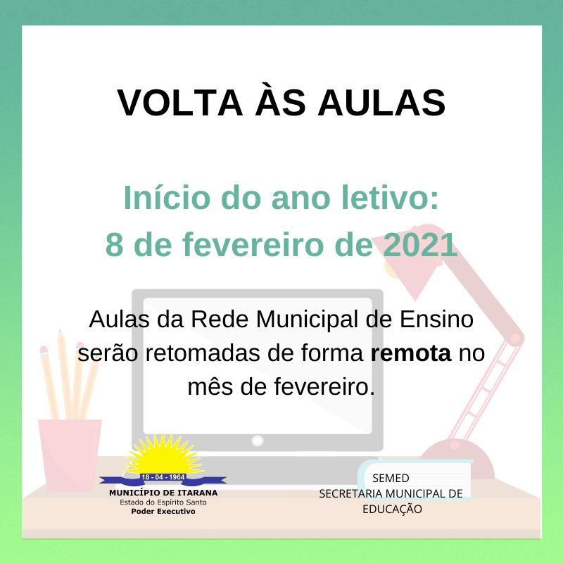 Na próxima segunda-feira, dia 8 de fevereiro, as aulas da Rede Municipal de Ensino de Itarana serão retomadas no formato remoto....