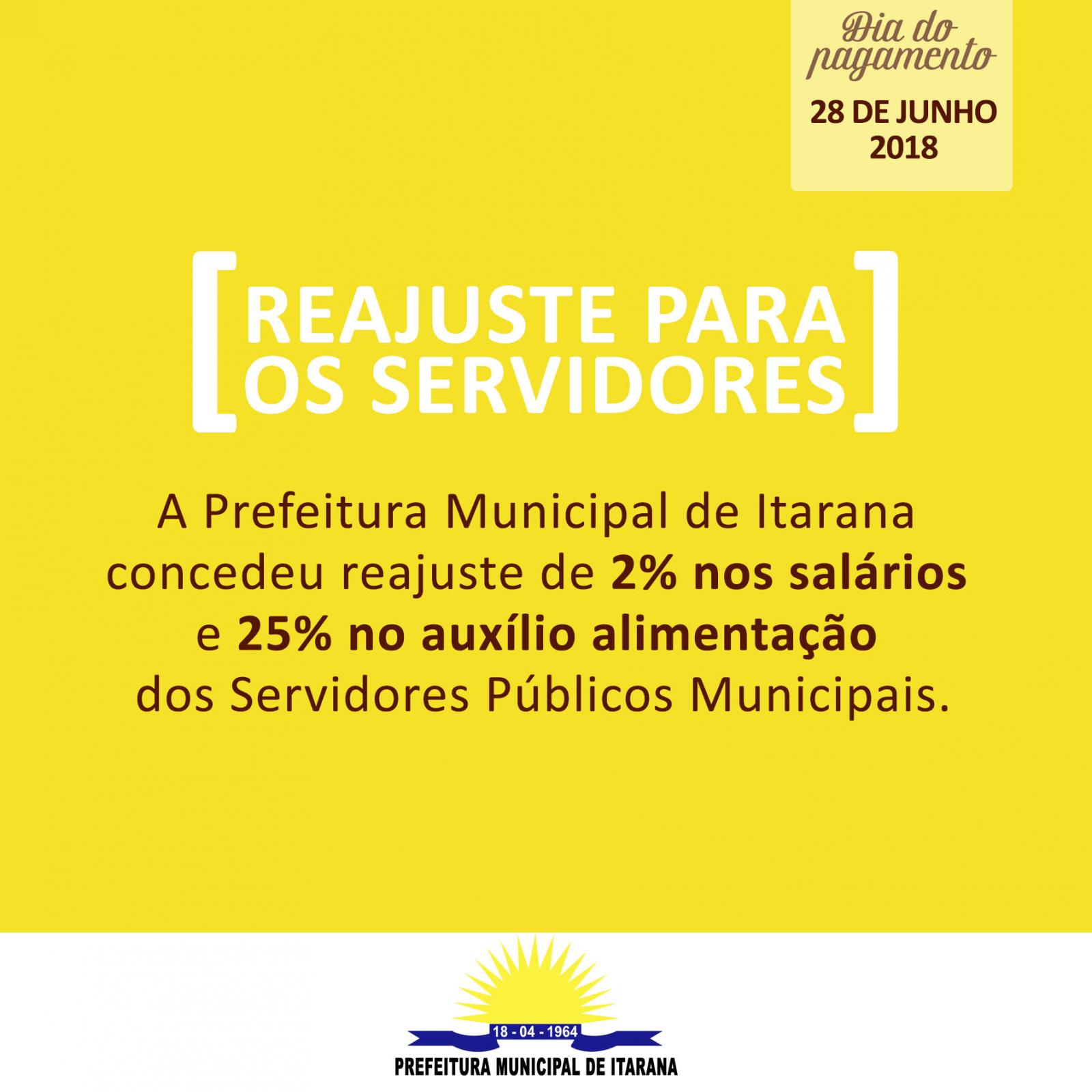 A partir deste mês os servidores públicos municipais de Itarana vão contar com reajuste de 2% nos salários e 25% no auxílio alimentação, concedidos pela Prefeitura Municipal de Itarana. O reajuste não se estende aos subsídios do prefeito, vi...