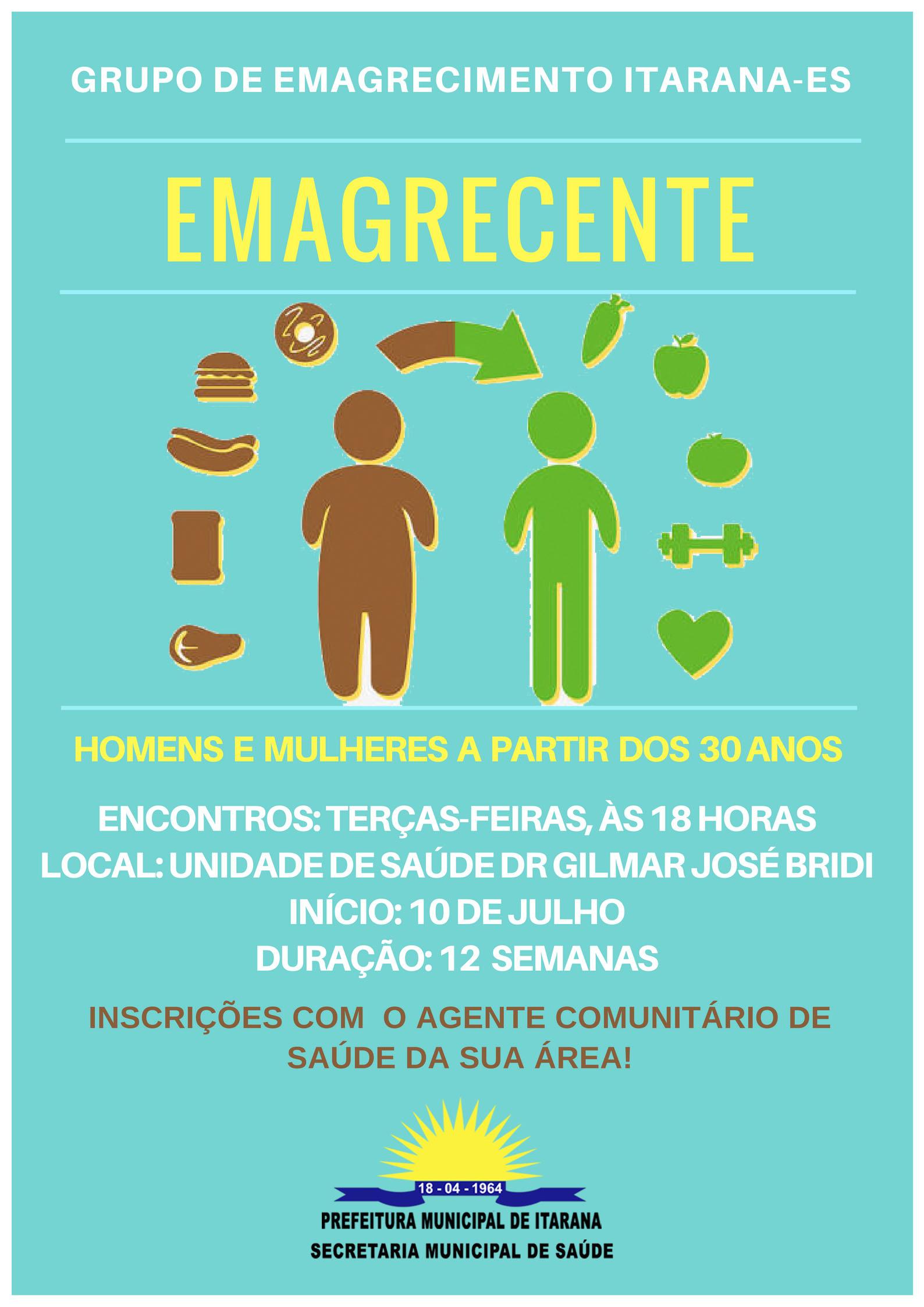 A Secretaria Municipal de Saúde de Itarana (Semus), vai iniciar no dia 10 de julho o projeto Emagrecente, que vai reunir homens e mulheres a partir dos 30 anos em um grupo de emagrecimento saudável. O projeto é gratuito e vai contar com profission...